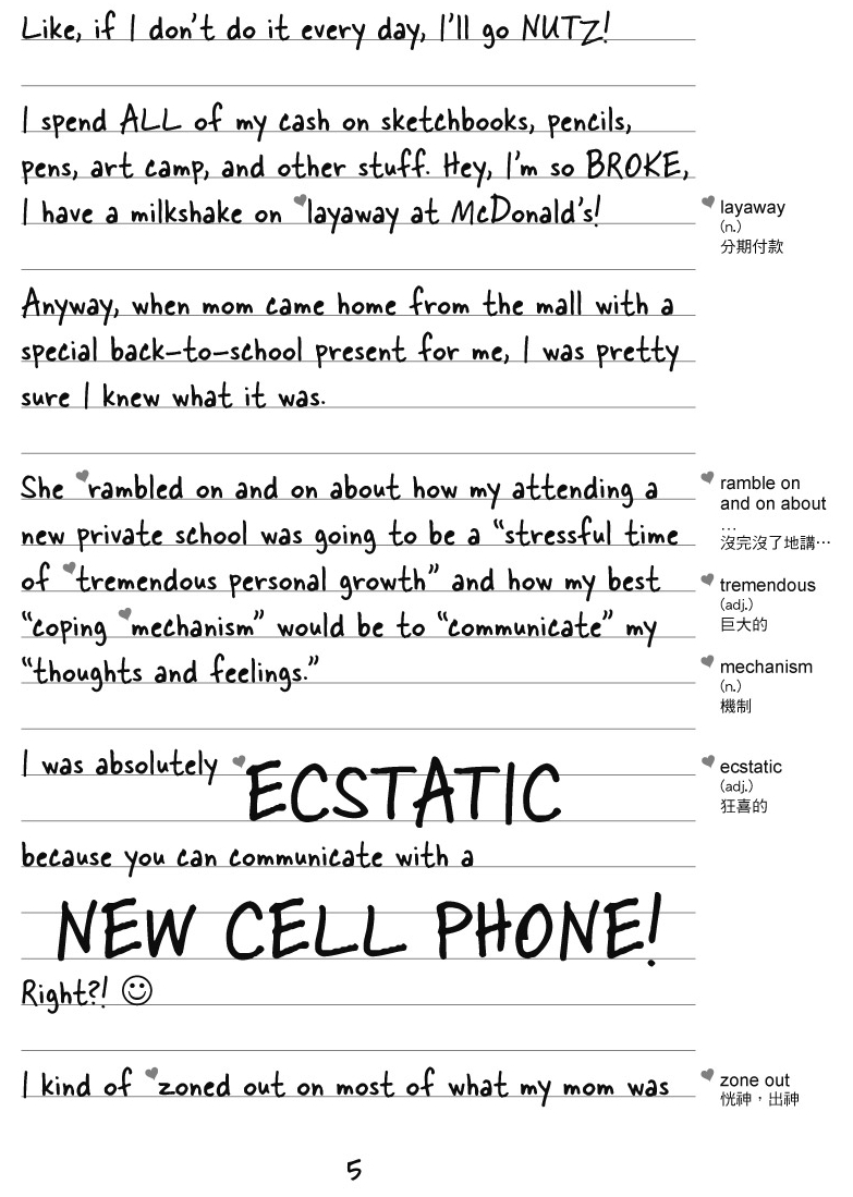 我媽開始長篇大論,說什麼我去上這所私立中學將會經歷「極大的個人成長」,而「面對壓力」時最佳的「處理機制」就是跟別人「溝通」,說出自己的「想法與感受」。