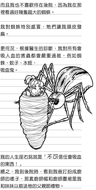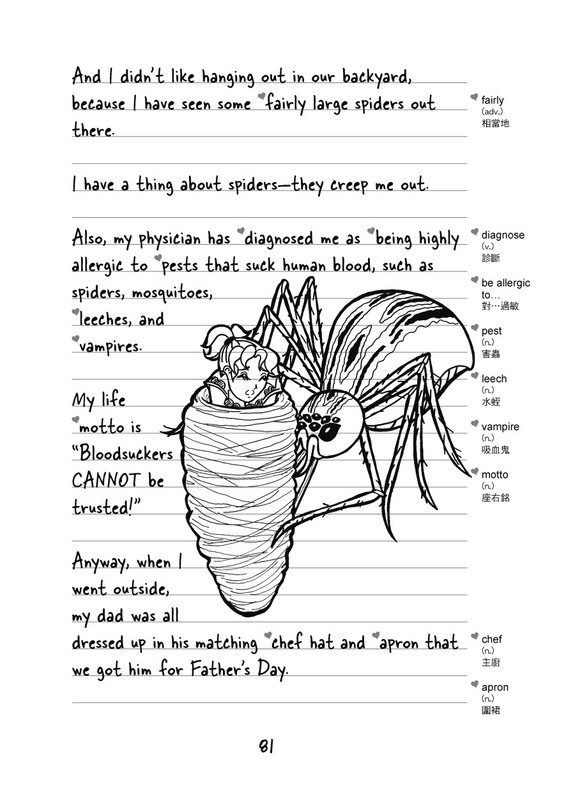 【怪咖少女事件簿1:明星中學初體驗】讓我毛骨悚然的東西是… By editor Posted 六月 1, 2017 In 精彩試讀 【怪咖少女事件簿1:明星中學初體驗】讓我毛骨悚然的東西是…2017-06-012020-05-11https://dorkdiaries.jwbooks.com.tw/wp-content/uploads/2017/06/dorkdiaries-logo.png怪咖少女事件簿https://dorkdiaries.jwbooks.com.tw/wp-content/uploads/2017/06/tk1-18.jpg200px200px 0 閱讀英文小說,是提升英文能力最自然的方法! 請照下列三步驟進行閱讀: 1.先大略讀過一遍,遇到不認識的單字或句型,別急著查字典,先試著瞭解 故事在說什麼。 2.現在你大致明白內容了,請再重新細讀一遍,可以搭配中譯並就先前 不懂的生字、文法及句型做進一步的瞭解。 3.再讀一次英文原文,好好享受閱讀的樂趣! 妳也和妮琪一樣對所有「會吸血的動物」過敏嗎? 這樣看來,妮琪應該是無法譜出「暮光之城」的戀曲了(笑) 妮琪的爸爸整裝完畢,準備要大展身手 這次的後院聚餐,又會怎麼發展呢? 明星中學初體驗, 試讀 Recommended Posts《怪咖少女事件簿9:作秀女王的惡搞日記》試讀心得 / 嘎咪【怪咖少女事件簿9:作秀女王的惡搞日記】帳號密碼要用生命去保護!【怪咖少女事件簿9:作秀女王的惡搞日記】妮琪非但沒有被開除,還有專屬網站!